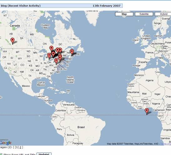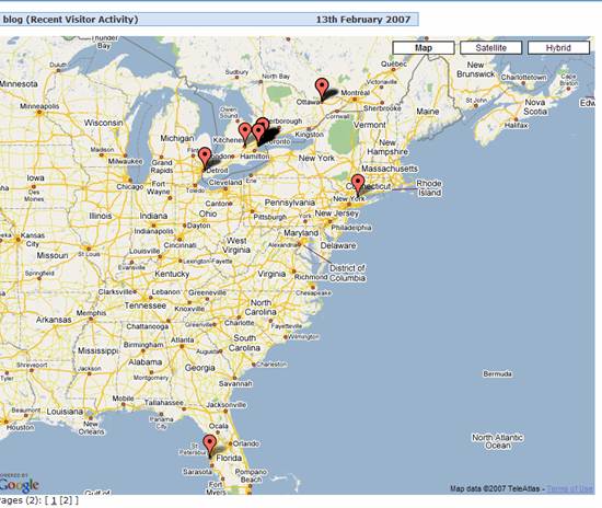 Feb 13, 2007 One of the tools I have with this Internet thing is I can see where blog readers are. Because I use a free program it only shows me those from the last hour or so. But It's still cool to check sometimes. Like the guy in Florida reading the blog in between golf games or water skiing with his kids. Generally I can't tell who is who. If someone logs on through a corporate server I can sometimes match the IP address to a person -- Fred the trainer works for Acme Chainsaws, the IP address is routed through acmechainsaws.com, and there ya go. But since most companies outsource their IT services (unless you're like a bank) it's all just gibberish to me. and to be honest, I rarely look at it for this very reason. But anyway, say hi to our readers in New Jersey -- I think I know who that is. Ottawa, Montreal -- not sure. Windsor? Could be Steve Yzerman on a long lunch.