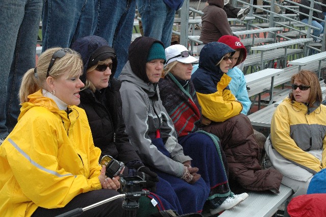 April 27, 2009 Field lacrosse. Spring field lacrosse. In the icy days of winter our memories are usually of warm days, sun-dappled pitches and time spent with friends. But memory is a cruel thing, and it's easy to forget the reality. The original forecast for Sunday was hot and sunny, revised to cold and rainy, revised again Sunday morning to 16 and clearing. Ha! Sixteen would have felt life the Bahamas to us. No, what we got was seven degrees under grey, dark skies with a raw biting wind that would peel the skin off your cheeks. Welcome back to spring field lacrosse. The boys had a fairly good start to the season, dropping a 4-2 decision to traditional powerhouse Six Nations in a very close game, and then dumping Hamilton 8-2 in the evening game at McMaster University's Ron Joyce Stadium (in front of a less-than-capacity crowd.) So, on balance a good start for the Hawks. On the sidelines, we shivered. I wore jeans and a t-shirt. Over the t-shirt was a fleece. Over the fleece I wore a wind-proof spring jacket. Over that, I wore a heavy wool winter coat. And I wore gloves. And a ball cap. And it was still cold. Not so cold that my camera didn't work, and I snapped this shot that looks more like a scene from the Mount Everest base camp than moms watching field lacrosse. Next weekend: Kitchener.