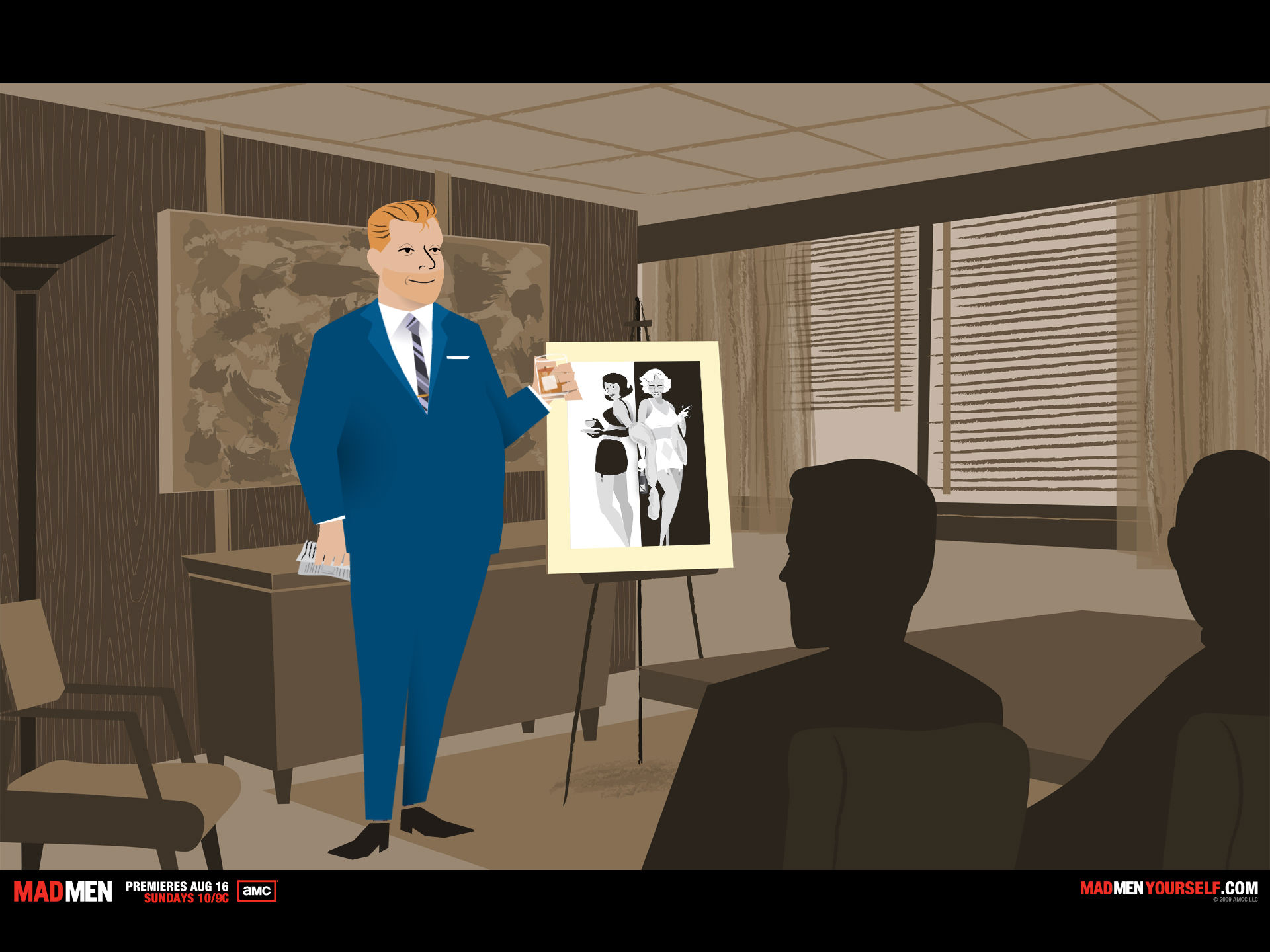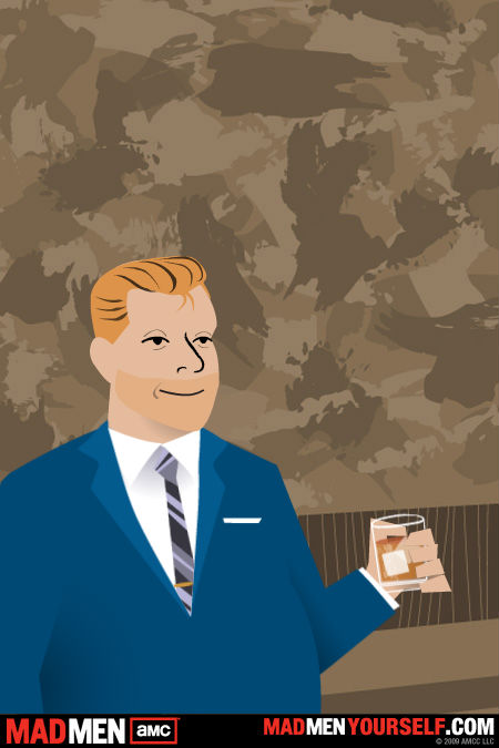 July 31, 2009 In a few hours we will begin the penultimate long weekend of the summer. It seems just a wink ago we were standing in slush pining for Victoria Day, but that's the relentless march of time blah blah blah. I remain hopeful that summer will yet break out -- Al Gore warned me it was going to get warmer -- but thus far, I've been disappointed. Our weekend schedule of obligations (now that we have successfully managed to show up for lacrosse officiating on the wrong nights, rinks, or not at all, a feat that for once wasn't my creation) is quite light, save for about a four-hour block on Sunday afternoon when I'll be literally chilling in a rink watching Pad at a hockey camp. More importantly, Pad, Chris and I will be baking a cake that will be the centre piece of the festival of Laura, who will be marking, if not actually celebrating, a birthday on the long weekend. More often than not in the last decade, she's marked the occasion in Cape Breton, often without me as her and the boys would decamp for the sacred sod for virtually the entire summer. But as the boys get older and have commitments, such six-week excursions are no longer practical, not to mention that while they are both handsome and well mannered, neither is quite as cute as they were 10 years ago and thusly perhaps, maybe, the act wears thin on relatives over a six-week period. And so it is that Laura will eat bad cake on a good pa(d)io and mark her remarkable 28th birthday -- a number remarkable not in its chronological composition but in the Hogwarts-like calculus that leads to it representing her age. All of which is besides the point. She's a great mom, wife and friend and everyone who knows her treasures her friendship and treats her like a princess (lest she turn on them with the quiet, determined focus of a hockey mom and serial killer and destroy their life.) Anyway, Happy Birthday. You are the best. - - - I mentioned here the other day that we are well into season 2 of Mad Men, watching it at a nice pace on DVD. The show is outstanding -- brilliantly cast and acted, well written, and slavish devoted to the detail of the period it portrays, which is the early 1960s in New York. The title is derived from Madison Avenue, home then to the world's top advertising agencies and the men who ran them. Hence, Mad Men. And make no mistake, the world was ruled by men then. The show is remarkable for its unflinching, warts-and-all depiction of life then. Sexism, misogyny, racism, anti-Semitism, and political incorrectness are normal, matter of fact accessories of every day life. The men all drink -- every office has a bar, and they drink all the time. They womanize with abandon. They all smoke, too, everywhere. As do the women, who are invariably called girls. "Girls, get us some ice, will ya?" OR: "Don, when did you get the new girl?" -- meaning a new assistant or secretary. In the context of 2009, the show's plots and sub-plots can make you very uncomfortable. In one episode, a secretary reports some money missing from her purse. The black elevator operator -- well respected and friendly -- is fired, the assumption (incorrect) being that he must have done it. Anyway, if you haven't seen the show, wander to a video store and start with season 1, disc 1. If you like edgy drama, you'll love Mad Men. - - - For those who have seen the show, there's an app on the Internet that allows you to create yourself as a Mad Man character. You've given a series of options for body shape, hair colour, etc etc. So, I did the exercise and I have to say, the result was a disturbingly accurate image of me. So, here I am enjoying a Diet Pepsi at the firm.