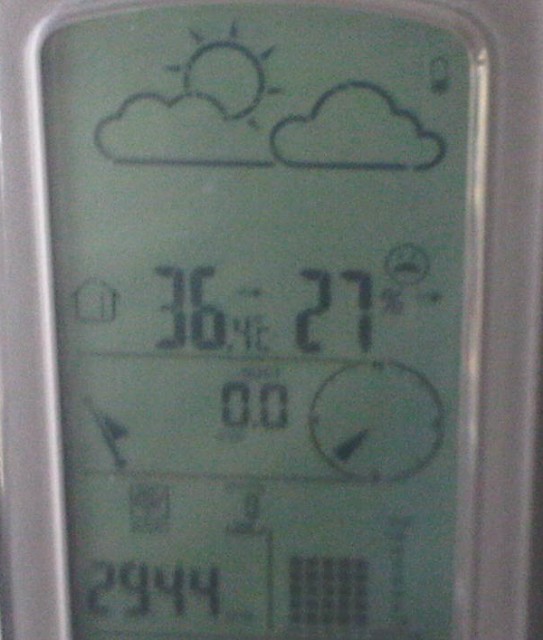 - - - As Charles Manson said to his prison guard: Am I crazy, or is hot in here? Yes, you’re crazy but it is also actually hot. Really hot. Stupid hot, as Pad called it yesterday as he finished working out at BTNL. When I was making breakfast for the big guy yesterday, the temperature topped 30 degrees at 10:18a. At 9p last night, it was still slightly over 30. We have a funky digital weather station in our yard and the thing is amazingly accurate. It gives you the real temperature – not the “in the sun” reading – and when it tells you it’s going to rain, well, it is going to rain. I took this pic of the weather station monitor in the kitchen yesterday at about 3:30p yesterday afternoon. This is hot. 36.4 -- and note the 0.0 wind speed. So, at least there was no wind chill!