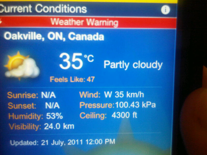 For illustration and educational purposes, here’s a shot of the Weather Network app’s reading for yesterday afternoon around 4p. I set it to display in Ye Olde English reading, just for old time’s sake. The “feels like” temperature of 120 degrees confirms my assertion that it was – and will continue to be, apparently – hot.