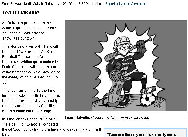 - - - Beyond that, I got nothin’ today and little inclination to troll the internets looking for anything. One loyal reader emailed to point out the editorial this week in Oakville Today, with the headline appropriating a certain blog’s nomenclature. The sentiment behind the editorial is an excellent one and you can click on the screen grab below to go to their site and read the whole thing. I like the cartoon, and no, legal action is not anticipated with Metroland. Laura and Chris finally return home on Sunday and we’re looking forward to that. In the meantime we will continue to laze about, work the barbeque, keep the beer fridge stocked and try to stay cool. I hope your weekend holds summer fun and adventure. Make sure the little ones (and big ones too) drink lots of water, be careful on the roads and lakes, and as always, hug the kids.