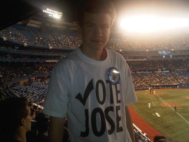June 29, 2011 We went to see the Jays-Pirates game last night, something we don’t often do but with company in town and the dome open and a brilliant summer night waiting, away we went. The good guys lost 7-6, but you couldn’t expect much more in terms of entertainment value at the ball park, including six homers, four of them off Toronto bats. It was Tweeting Tuesday at the Rogers Centre, so periodically they would flash something on the board and you were encouraged to Tweet or text a message to have a chance to win. The last one of the night was a Blue Jays Canada Day ball cap. Chris grabbed his mother’s iPhone and fired off a note that he really wanted that hat. We all laughed – like he’s gonna win, right? Ten minutes later a young woman shows up at his seat – he didn’t win the hat, but they liked his messaged so they brought him a “Vote Jose” t-shirt, part of the Jays’ campaign for slugger Jose Bautista’s appearance at the All Star Game. We all cheered and had a good laugh.