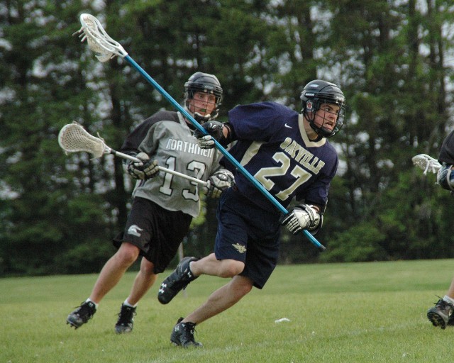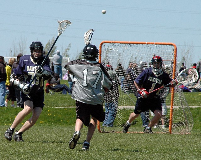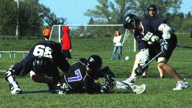 May 18, 2009 The midget 1 Oakville Hawks lost a 5-4 heartbreaker to Orangeville yesterday on a last minute goal at provincial qualifiers. It was a great game to watch but we all nearly froze off our titanium shafts and lacrosse balls. The wind was relentless so the clear sunny sky was little comfort. Back at it tomorrow morning early against St. Catharine's. Below is a picture of Hawks 'keeper Brennan Donville and an unknown defender thwarting a Northman attacker.