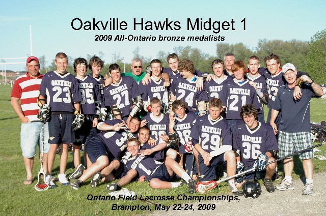 May 19, 2009 I could take a few paragraphs to frame what happened last night in the fading sunlight of the BBQ season's first long weekend, but you can take all that flowery prose as given. Simply put, the midget 1 Oakville Hawks played Six Nations last night in their third game of a very long day. A win would send them through to the provincial championship tournament next week as one of the three top teams in southwestern Ontario. A loss would mean they could all sleep in. I have been driving my kid to lacrosse games for years. It is a tough, draining, physical sport. There's no gliding in lacrosse -- stop moving your feet, you stop moving. Anyone within 10 feet of the ball can be hit at any moment, regardless of whether they have the ball. That make for some interesting collisions, often when you're not expecting them. Six Nations is consistently along the very best. They play hard, clean and with a high level of technical skills mixed with tremendous inherent talent for the game. The last time the top 1993 Oakville cohort beat Six Nations was back in novice, I was told. Almost too many years ago to count. To play Six Nations is to understand where you fit compared to the best. Last night, the Hawks won 7-6 in a terrific match with several lead changes. The result could have gone either way. But for once, our guys found a way to win when things got tough. For the guys who have coached these kids for so many years, it had to have been a great moment.