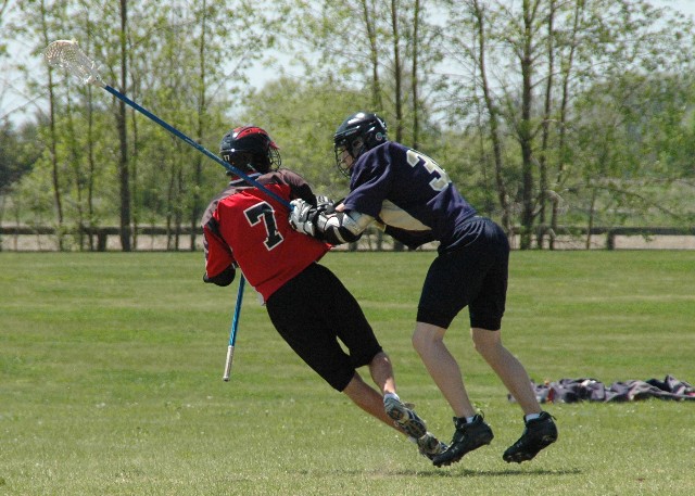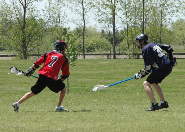 May 25, 2009 I'm going to keep it brief today. Too many things to do in the real world, I guess. But first, a quick recap of the weekend. The midget 1 Hawks lost their semi-final 7-4 to Halton Hills, setting up an appearance in the bronze medal game. The 1993 cohort of Oakville lacrosse, I'm told, only won a medal on one previous occasion, as novices many years earlier (before my kid played). Only four or five players from that novice roster are still among the numbers on the midget roster today. There's a lesson in there somewhere. Before the game, it was abundantly clear to all the kids and parents that everyone really wanted to beat Oshawa and get a medal. Because as midget-age players, this was it. This would be the final game of field lacrosse many of the boys would play. There's no field program for intermediate. Hockey and other interests will drag them in different directions. They would get to stand together one last time on the big field in competition and then move indoors for the box season to finish up their minor lacrosse careers. The game with Oshawa was extremely close and hard fought. Oshawa played an excellent game of patient ball control in the face of Oakville's sturdy defence. Our attack could best be described as streaky and opportunistic. We have a core of guys who can bury the ball on attack. We have a core of guys who can lay you out flat out flat on defence. After regulation time the score was 4-4, which is very low scoring for field lacrosse. The game would go to two four-minute straight-time halves. The first half yielded no goals. The second half was shaping up the same. With 40 seconds left, Brian Cole did what he's done all year and played sniper, burying the go-ahead goal. Oshawa called a timeout to regroup for the final seconds. Oakville won the draw and the final seconds were basically a footrace with the Oakville guys sprinting and passing to kill the clock, which they did. Everyone said the same thing of this team, the core of which has been basically the same for five years now. "Finally, a medal." To be among the top three in Ontario is a great achievement, and at midget 1 -- the oldest, biggest and toughest level of minor field lacrosse -- it is a wonderful statement about how far this group travelled. Personally, I felt best for Lorne and Bob and Hunter and Jeff, who have stood on the sidelines with these guys for years, teaching and waiting for them to discover that they have what it takes to beat the likes of Six Nations and Orangeville and Oshawa. And finally, they did. In all three of those games, Oakville broke a game open to win, instead of the other way around. Congratulations to all the boys, to the coaches and well done to the parents who have been a big part of the team. - - - Just as an aside, a personal highlight of the weekend. (Hey. It's my blog.) Early in the semi final game, one of the speedsters on Halton had the ball and was positioned one-on-one against #39 from Oakville. From the sidelines and from the field, his teammates implored him to "take this guy. You can beat him." After sizing up the defender for a moment, the Halton player made his move. The photos below captured that moment, first the challenge, and then when the Halton player went airborne backwards after getting hit head on. He ended up flat on the turf. Apparently #39 had other ideas about who could take him. The Oakville bench went nuts. The next time he went one on one with #39, he passed the ball.