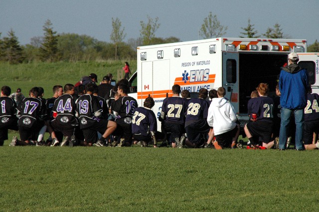 The kids were all banged up and exhausted from the long day, so I'm not sure if the full impact of their accomplishment sunk in. But they played great and got the result they needed. And next weekend, they won't be sleeping in, but instead will do it all over again in Brampton at the provincial field lacrosse championships among the best teams in Ontario. Well done guys. An extra ice pack for everyone! - - - The game also featured one of the scariest moments I've seen on a lacrosse field. A young Six Nations attacker was on the receiving end of a hard, clean hit and went down very hard and stayed down. One of the dads on the Oakville team is a doctor and ran to the spot immediately. Parents and players on both ends of the field looked on with genuine concern as the boy was virtually motionless. Eventually word trickled back that the young man was probably OK, but an ambulance had been called as a precaution, which was obviously the right thing to do. Both teams sat quietly on the sideline while the Six Nations coaches and the Oakville doctor staff tended to player. As the ambulance pulled up, the Six Nations kids quietly walked over to where their teammate was and they took a knee, as we say, to keep him company and send him off with support. Moments later, they were joined by the Oakville players who took the same pose. Thankfully it seemed the young athlete was not seriously hurt. The image of all those kids kneeling around the player as the EMS crew did their work was very compelling and said a lot, to me at least, about sportsmanship and priorities. My understanding is that in spite of the result of Sunday's game, Six Nations also made it through to provincials, so maybe we'll play them again. Hopefully with that injured player back in the lineup.