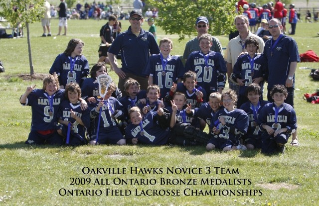 - - - Halton Hills went on to win the gold -- congratulations to them. They play very well -- hard, fast and clean. They are worthy champs for Midget A. Peterborough took the silver. - - - The midget 1 squad was just one of six Oakville teams at provincials and all six made it to the final four playoffs on Sunday. I'm not sure if any other minor lacrosse association was so well represented on the final day, but regardless it was a great day for Oakville lacrosse. In Novice A, Oakville won silver. In Novice B, Oakville won silver. In Novice C, Oakville won bronze. In Peewee A, Oakville lost the bronze game 5-4 to Toronto Beaches. In Bantam A, Oakville won bronze. And in Midget A, well, you know that story. Bronze. Six teams, five medals. Congratulations to all the Hawks players and coaches; congratulations to all the winners and medalists on all the teams. And thanks to our hosts in Brampton. It was a great day with wonderful weather and a friendly, festive atmosphere as cheers and groans exploded from all around the sprawling Sandalwood Sports Fields complex. My days of spring field lacrosse are, sadly, over. But what a finish. - - - As noted above, the Oakville lacrosse program has served notice that it has the foundation in place to be a powerhouse for years. Strength in novice, peewee and bantam bodes well for the future. And as also noted, the midget Hawks know full well that early success does not give you a free pass to future success. The 1993 kids -- the old men of our program -- qualified numerous times for the field provincials, but after novice they never again played in a medal game until yesterday. So here's a toast to the smiling faces below of the Novice 3 Oakville Hawks -- proud representatives of the future of Oakville lacrosse. Here's to their great 6-5 win over West Durham on Sunday. And here's hoping in the years ahead they find the magic of sports alchemy to turn bronze into gold many times! Well done Hawks!