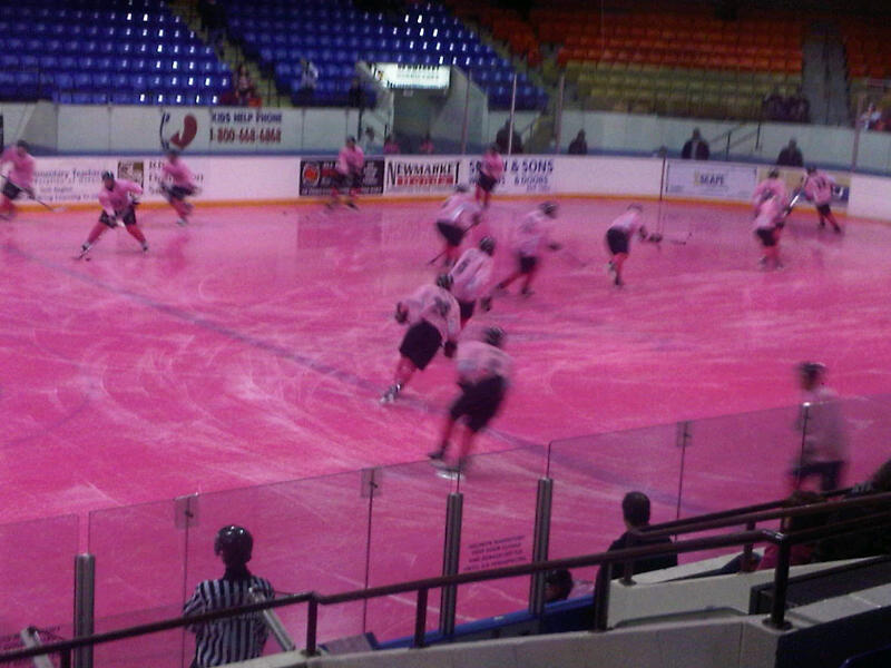 Oct 30/31, 2011 The Blades did in fact play on pink ice in Newmarket on Thursday night. It was that's team's breast cancer awareness fundraiser and the pink ice was a cute idea to raise the profile of the event. And as you can see from the images below snapped on my Blackberry, the ice sure was pink.