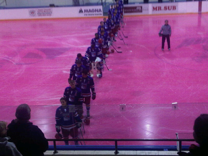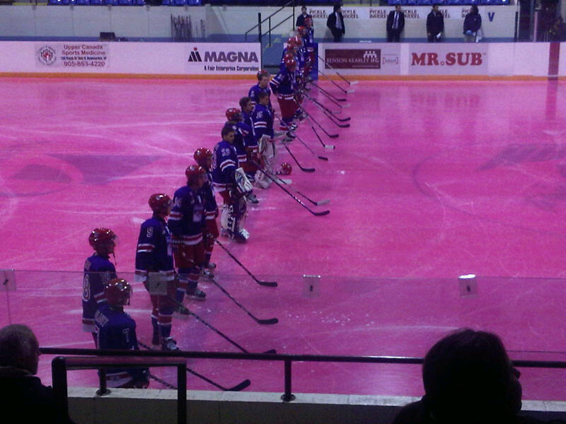 Oct 27 2011 Chris and the minor midget Knights hung on for a 2-2 draw in house league action Tuesday night, again opting to spend much of the third period as spectators. I was seconded into bench duty for this one (I’m on the roster as assistant trainer) and since I came to the 7p directly from work, I spent most of the game hoping no one would be hurt on the ice, since my leather-bottom dress shoes would have made for an interesting journey across the playing surface. Luckily, everyone was spared that image. - - - Adventures in hockey parenting continue tonight, as the Blades are in Newmarket for what is shaping up as the biggest test of the year thus far. Newmarket is ranked #5 nationally and the Blades snuck into the national ranking this week for the first time (there are 120 junior A teams in Canada), at #20. So the game is shaping up as a good one. It is also Pink in the Rink night in Newmarket, the team’s annual fundraiser for breast cancer awareness. The ice is going to be painted pink for this one. That should be interesting and a large crowd is expected. - - - Tonight’s schedule will mean at least two things.