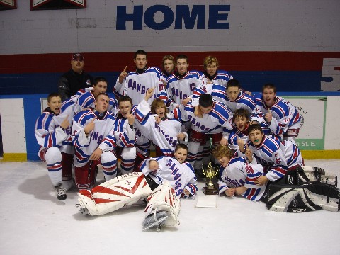 Dec 3, 2007 The single-A bantam Rangers won their second tournament in a month yesterday, beating Bracebridge 6-3 in the final of a tourney in Fergus. Nick Powidajko -- three points in the final game and a hat trick earlier in the tournament -- was selected MVP. Nick is a super guy who always gives a great effort, so I know a lot of people familiar with bantam hockey in Oakville will be thrilled with his success. Jake Cussen also returned to the lineup after a three weeks on the shelf with an injury, most of which was spent leaning against his locker and trying to look cool for the girls. Congrats to Coach Shawn and everyone on the A Rangers. Well done. You will note that most of the hair that was buzzed away after the Lake Placid win has started to return.