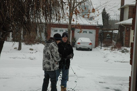 Dec 16, 2007 OK, a busy weekend of hockey. Let's go to the highlight reel . . . - - - Pad and the AA Rangers had a good practice Friday night then bounced back from their dismal showing in friendly Georgetown by beating Guelph 4-1 on Saturday night. All the boys played solidly and Dan French -- back after a long rehab from knee problems -- looked good in chalking up his first win in his first start. Patrick Griffin lit up the board for three goals. Today's game in Stoney Creek was postponed because of snow. - - - Chris and the Flyers practiced last night and then harnessed all that energy to beat the Wings 4-0 today, in spite of the blizzard. Chris and I arrived early at the rink and -- long story short -- someone walked off with his stick, which was with his gear while he watched the first game of the day while waiting for his game. A friend on another team was kind enough to lend Chris a stick and the big guy put it to good use, scoring the first goal -- and what proved to be the winner -- to help his team to a win. In the meantime, if your son mysteriously has a blue hockey stick with purple tape, contact me. Chris would like his stick back! - - - Yes, Virginia. The King-Arnolds have exterior seasonal illumination. Frankly, it's not my best work. Lake-effect snow filled the air on Saturday morning as I dragged the ball o' lights out of storage to untangle and test. And the roof was covered in snow and Laura said that if I dared get the ladder out and go on the roof in those conditions she'd kick the ladder over once I was on the roof to ensure I stayed up there until the Super Bowl. So, I know how to follow orders. Anyway, eventually Pad came out to "help" and we managed to put coloured lights around the yard to some general effect to resemble a holiday festive environment. I hope this adds to your enjoyment of the season etc etc. Here's me and a local Ranger hockey player holding up one end of a big ball of lights.
