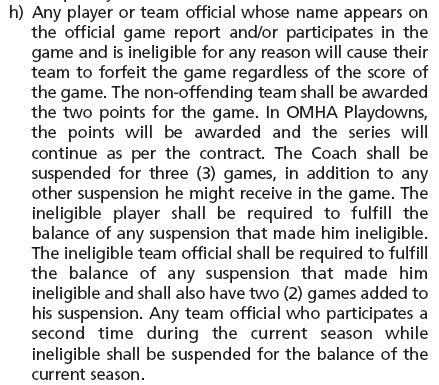 Feb 28, 2008 So, here's what happened in the bantam AA OMHA quarter final series. Game five -- which Oakville lost 4-0 to Belle River -- was protested by Oakville, the basis for the protest being that Belle River used an ineligible player. A player tossed from Friday's game sat out Saturday, then played Sunday. According to the OMHA manual of operations, his infraction was a two-game suspension. The apparent confusion on the Belle River end stemmed from the fact the back of the game sheet says a GM58 is a one-game suspension. But the OMHA manual of operations is clear -- it's two games. Here's the rule: