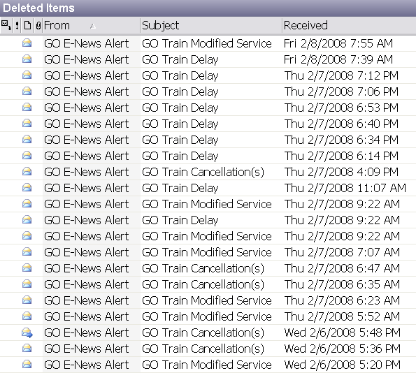 Remember I mentioned those email alerts GO sends out? A sample from the last day or so. And this is just for the Lakeshore West . . .