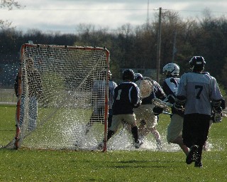 May 4, 2008 It's Sunday afternoon and I'm running on fumes. 5:15a came early after getting back from Kitchener last night around midnight following two lacrosse games and then the Ontario Newspaper Awards gala. The Midget 2 Hawks lacrosse squad had an oh-fer weekend, losing four in a row in two days in challenging conditions. Saturday was like playing in a swimming pool -- the rains were at times torrential, the wind whipping the rain parallel across the pitch and lashing us all into whimpering, soggy submission. The good news was that both games were played on artificial turf -- at Sir Wilfred Laurier University's Varsity Stadium and then later at Alumni Field. (Special thank-you to the folks at SWL for letting me use their spiffy athletic complex to change into my suit after the games!) The bad news is that at Six Nations, they didn't have artificial turf and field conditions for today's two games could best be described as semi-submersible. Below is a image that shows what field conditions were like this morning when we started at 8a. Oh, and it was 4 degrees, too. But still, it was fun.