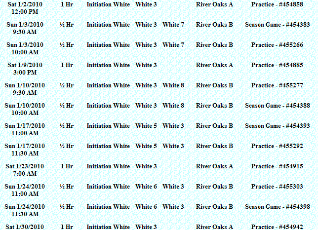 SCHEDULE You can view the full schedule by clicking here and then selecting "Initiation White" under the ALL LEAGUES button. Under ALL TEAMS, then select White 3. Boom! There's it is! In the meantime, here's what's coming up: