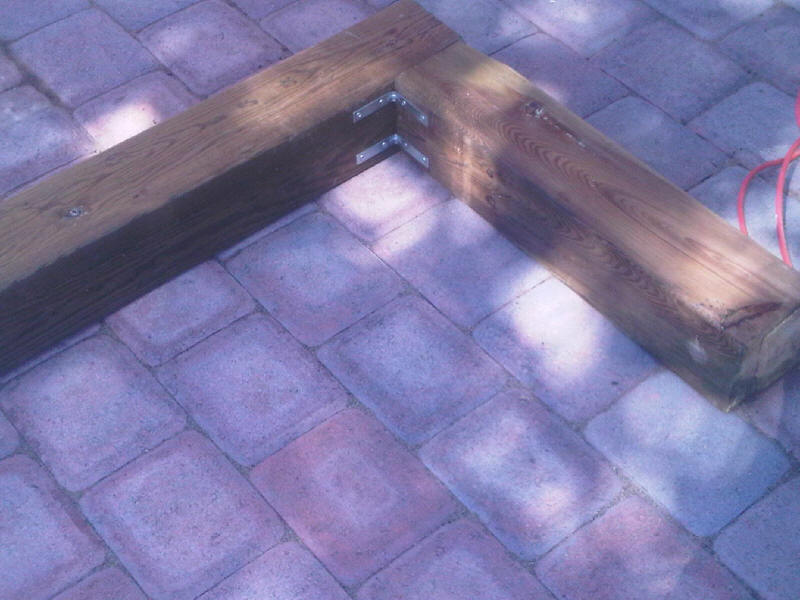 Angle brackets were used on each corner to secure the box. I wanted to do a mitre cut but apparently that's next to impossible with six by six lumber. The frames for the steps are also secured to the foundation with angle iron. |