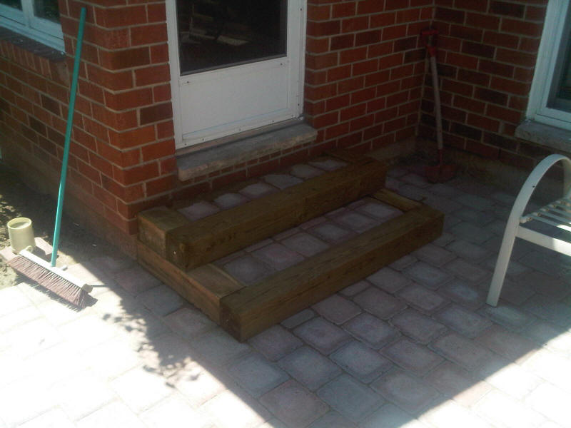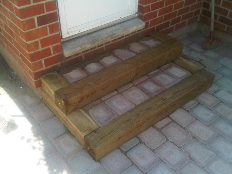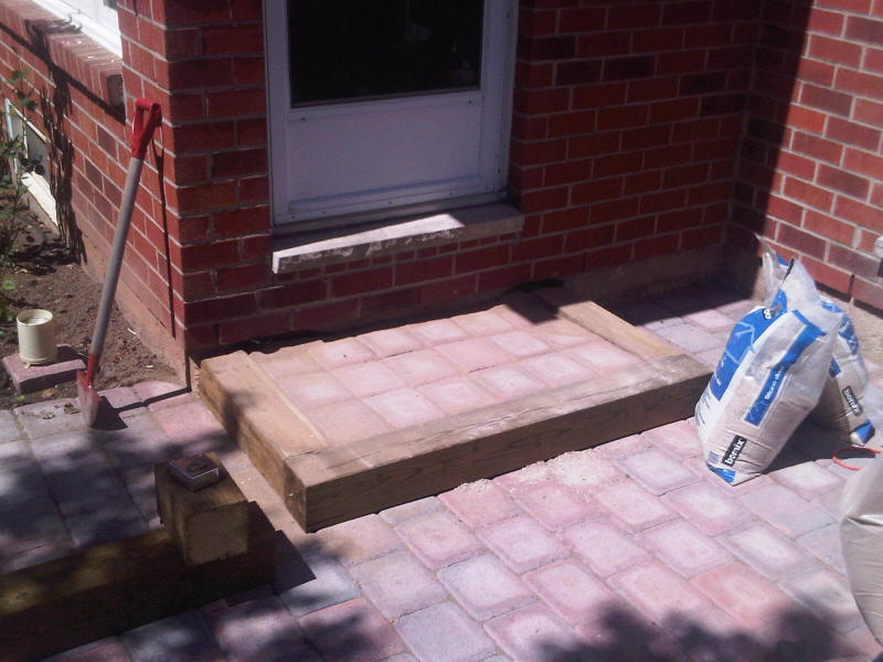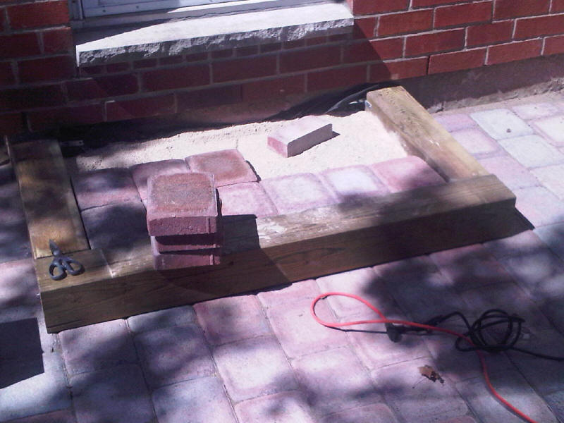 I stapled landscape fabric to the bottom of the step boxes to contain the screenings, which in turn would be the base for the paving stone, |